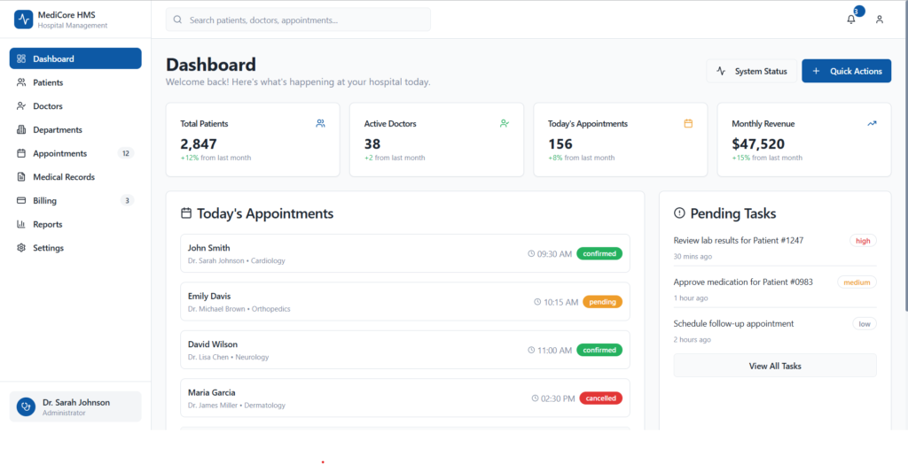 The Solution: We built a centralized Doctor Management module that provides a bird’s-eye view of 38+ staff members across 12 departments. The system tracks real-time availability, patient ratings, and experience levels to optimize clinical workflows.